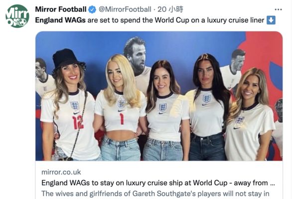 2022卡達世界盃即將在於11月20日至12月18日舉行,場外的「大嫂團」(WAGs,指球員妻子或女友)的一舉一動也受到關注,先前各國「大嫂團」還被禁止穿著太辣,不能和球員同住等,如今英格蘭「大嫂團」也規劃好了自己的世界盃奢華行程。