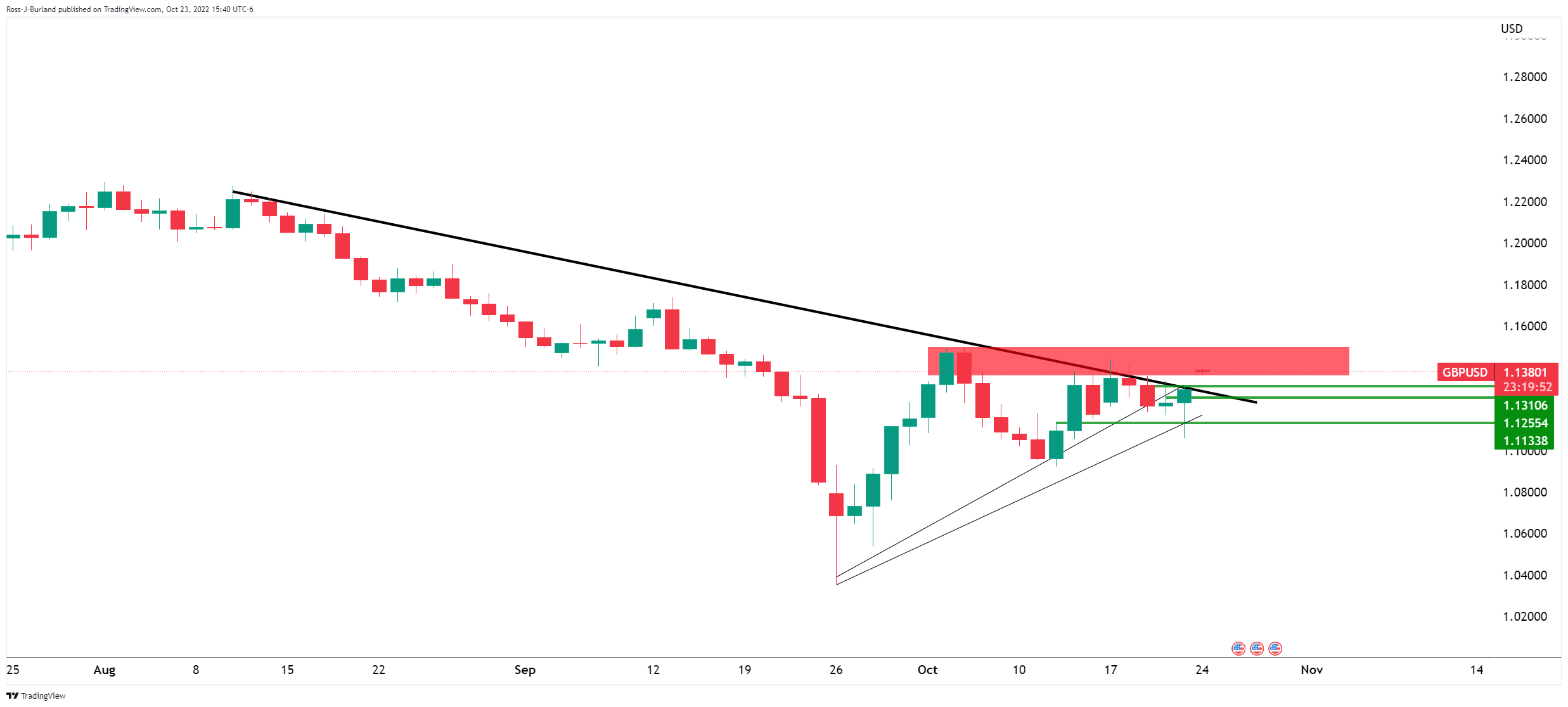 英鎊/美元本週開盤上漲。 《華爾街日報》的一篇報導稱,一些美聯儲官員對大幅加息應對通脹表示出更大的不安,此後美元承壓。在英國政治形勢方面,英國前首相鮑里斯·約翰遜和里希·蘇納克本週末沒有達成協議,使蘇納克穩穩地走上成為首相的道路。英鎊/美元因此突破關鍵阻力,如下所示: