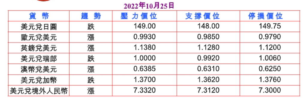 隨後BOJ疑似連續兩個交易日干預,美元兌日圓突然重挫至145.61低點,但BOJ總裁黑田東彥表示下一財政年度消費者物價指數(CPI)可能回到2%目標之下,重申保持超低利率,最終能阻貶日圓,並據標準普爾(S&P)全球月度調查美國10月製造業與服務業PMI初值分別降至49.9及46.6,綜合PMI初值亦跌至47.3,但美國9月全國活動指數升至0.1,而且美國聯邦準備理事會(FED)預計下月再度大幅升息,推升公債收益率,扶助美元兌日圓收復大部分失地。預估今日美元兌日圓阻力於149.00-20,支撐於147.80-148.00。
