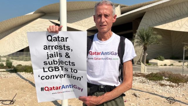 他被拍到站在卡塔爾國家博物館外,手持的紙牌寫著「卡塔爾逮捕、監禁和對LGBT人士進行性向迴轉治療」,以及#QatarAntiGay(卡塔爾反同性戀)的話題標籤。