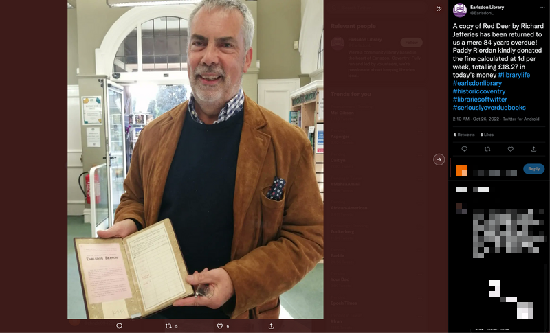 A copy of Red Deer by Richard Jefferies has been returned to us a mere 84 years overdue! Paddy Riordan kindly donated the fine calculated at 1d per week, totalling £18.27 in today’s money #librarylife #earlsdonlibrary #historiccoventry #librariesoftwitter #seriouslyoverduebooks pic.twitter.com/tAPwkFUnAq