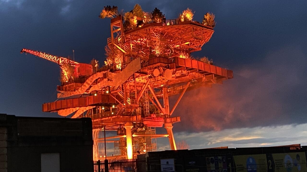 “看怪獸” 是一個35高, 重450噸的大型裝置。 原來是北海開採天然氣的平台,在“無封閉”創意活動里,它被運到濱海韋斯頓,改裝成一個有9米高的樹木盆景,10米高瀑布瀑布,由風能和太陽能設備,風動雕塑和滑梯組成的藝術裝置。