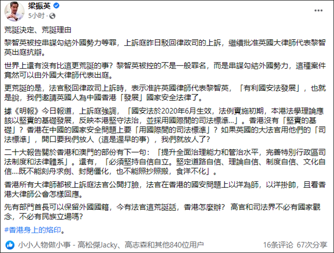 前特首梁振英臉書發文指香港法院批准黎智英聘英國大律師辯護是荒誕決定、荒誕理由。(觀察者網)