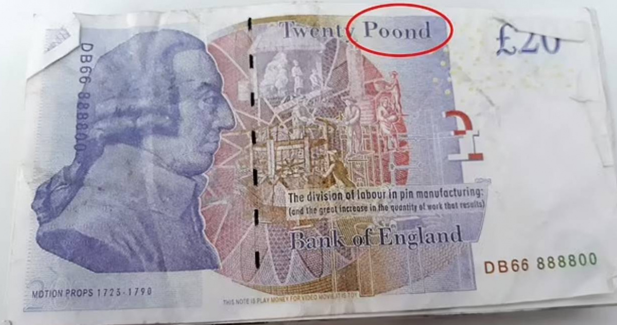 據《每日郵報》報導,33歲男子希克森(William Hickson)因持有41張、合計820英鎊(約新台幣3萬)的假鈔於2019年被捕。檢察官芬利(Andrew Finlay)指出,這些假鈔製作相當逼真精美,卻因為把鎊pound寫成口語化的「poond」而露餡,希克森雖坦承起初得到這些鈔票時沒有發現是假的,但他察覺後仍繼續使用,最終因在襪子藏匿假鈔被捕。