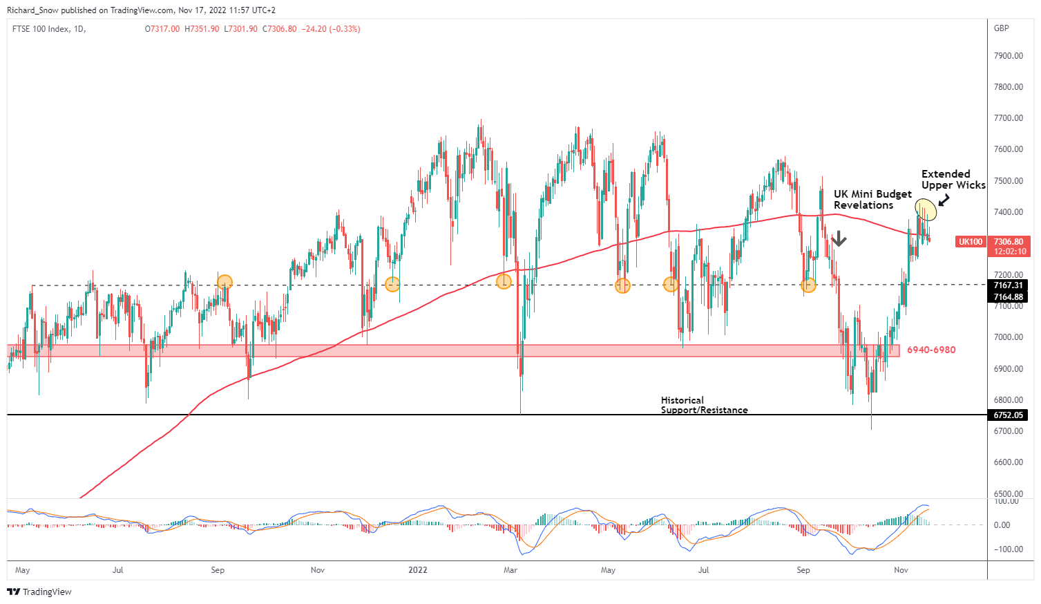 200日簡單移動平均線(SMA)附近出現了潛在回調的暗示,該移動平均線在聲明發布前是價格的即時阻力。如果該指數繼續走高,股市參與者將密切關注政府支出和能源補貼,因為快速上漲的物價給家庭實際收入帶來了巨大壓力。就在昨天,英國確認10月份的CPI通膨率與去年同期相比增長了11.1%。
