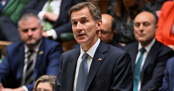 英國財相侯俊偉周四在國會,公布首相辛偉誠上任後首份財政預算案,他手持的預算案是綠色封面。路透