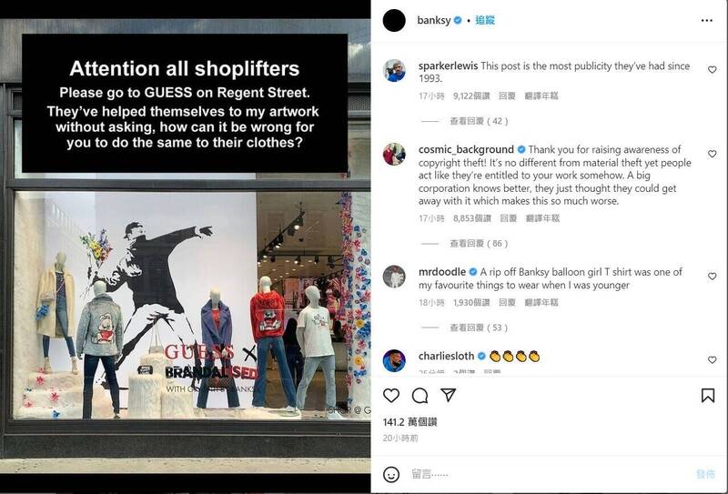 班克西18日在Instagram發文,貼出這家倫敦門市的櫥窗照,寫著「所有扒手注意,請到攝政街的GUESS,他們沒問過我就擅自使用我的作品,你們對他們的服飾也做同樣的事,怎麼會是錯的?」