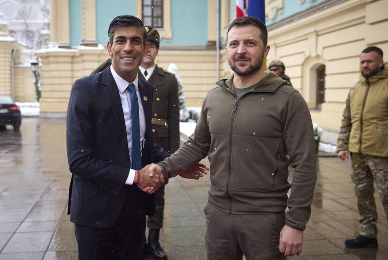 今(19)日英國首相蘇納克(Rishi Sunak)在上任後首次訪問烏克蘭,並在基輔會見烏克蘭總統澤倫斯基。(美聯)