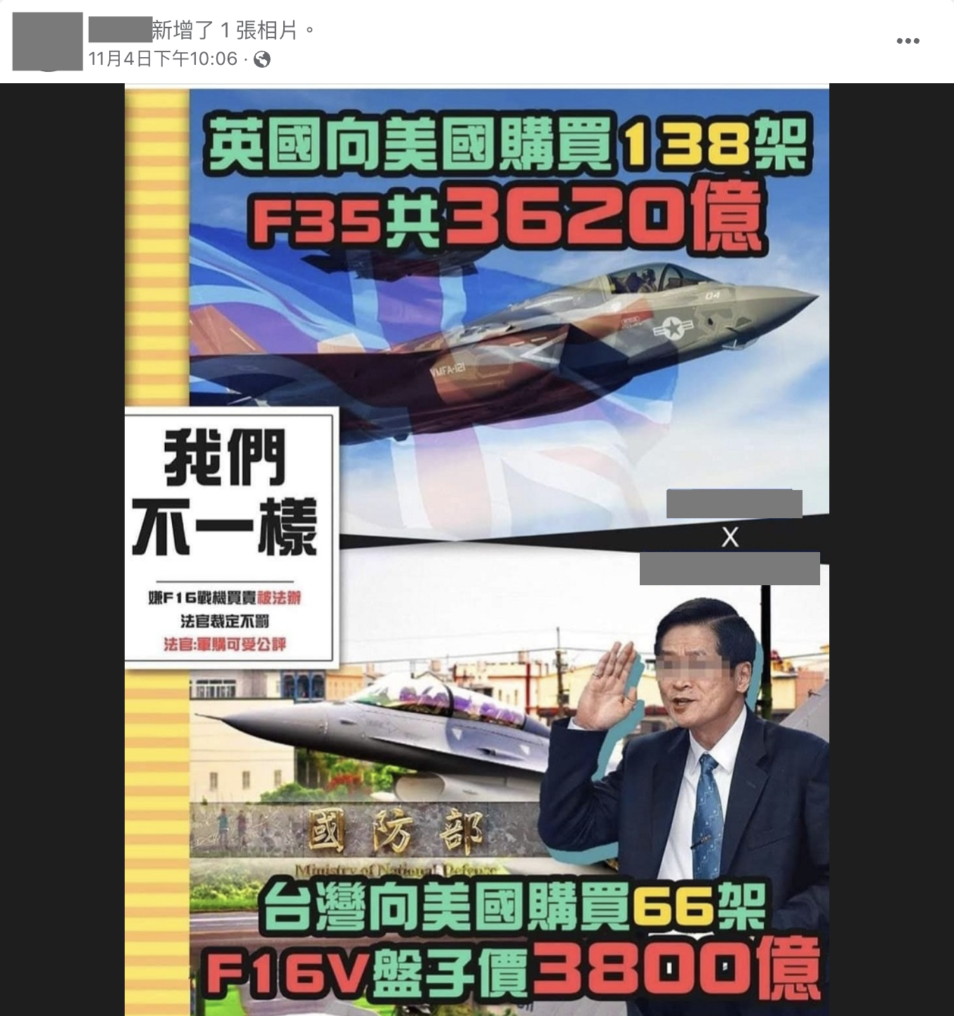 社群平台臉書2022年11月4日流傳一張圖卡,內容是上下兩張圖片,上圖是「英國向美國購買138架F35共3620億」,下圖是「台灣向美國購買66架F16V 3800億」。此外,圖卡中間有一段文字「嫌F16V戰機買貴被送辦 法官裁定不罰…」。