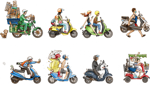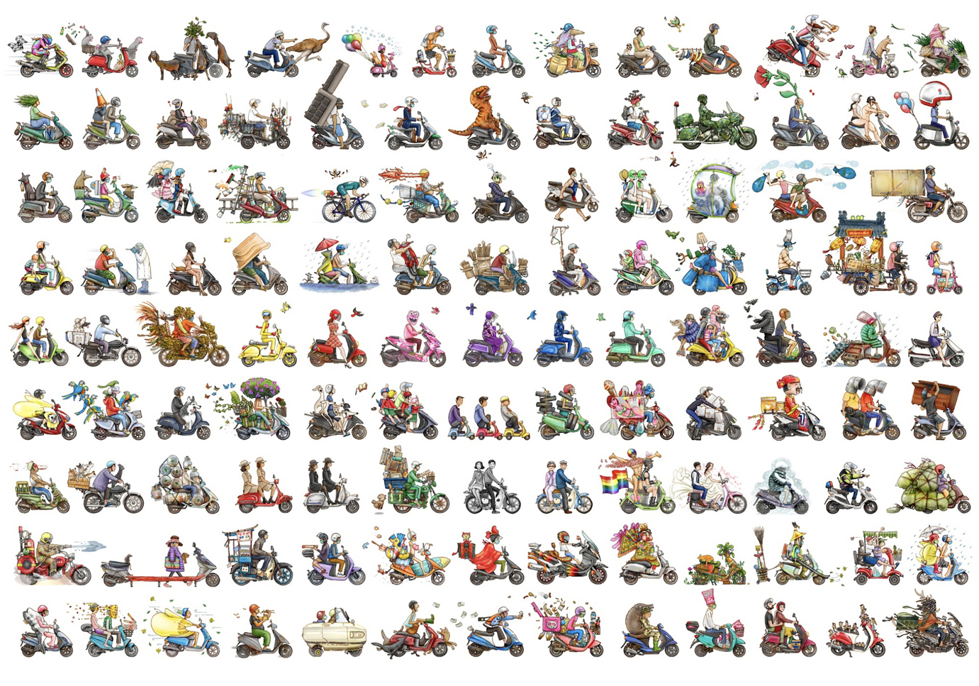 以自身觀察加上數千則的網友投稿,繪製出 100 張機車圖,Tom Parker 在這趟「路上觀察之旅」,看見了許多動人故事──無論是剛上大學的年輕人、六七十歲的爺爺奶奶,或者是外送員、郵差、警察、買菜接小孩的煮夫煮婦;機車陪伴許多人工作維生、快速移動,不僅僅是一台交通工具,更是許多台灣人的生活好夥伴。