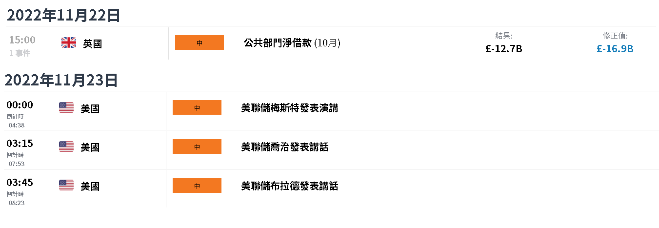 10月英國公共部門(見下方財經日曆)的支出超過了收入,使得英國10月的借貸額度達到歷史上第四高的水平。債務水平上升背後的自然經濟反應是提高利率,以補償投資者的違約風險。因此,考慮到利率和貨幣強勢程度之間的傳統正相關關係,英鎊的直接反應是小幅走高。儘管如此,考慮到對經濟衰退的擔憂和已經升高的利率,額外的激進加息對英國經濟來說是不可持續的。