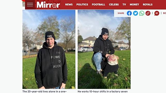 根據《鏡報》報導指出,20歲的艾許力收養了8隻貓狗,居住在公寓裡的一間小房間,因他買不起腳踏車當代步工具,只能每天走1小時去工廠上班,但時薪僅有6.81英鎊(約251元新台幣)。由於龐大的費用讓他無法支付瓦斯費,他只能到健身房洗澡、吃泡麵充饑,「我到了月底總是在擔心錢夠不夠,但比起我自己,我寧願餵食牠們。」