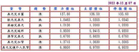 美國 11 月服務業回升,強化聯邦準備理事會 (FED) 繼續升息至明年的臆測,推動公債收益率上漲而支撐美元;此外,週二日本數據顯示,得益於新型冠狀病毒 (COVID-19) 疫情緩解更多人消費,10 月家庭支出連續第二個月較前月增加 1.1%,更較上年同期增長 1.2%,為連續五個月增長,但日本 10 月實質薪資較去年同期降 2.6%,為七年來最大降幅,突顯家庭負擔日益沉重及政府面對物價漲勢困境,並據日本央行 (BOJ) 總裁黑田東彥稱,一旦實現 BOJ 的 2% 通貨膨脹目標,政策委員可能辯論交易所交易基金 (ETF) 持倉,作為退出超寬鬆政策的部分舉措,但強調有必要維持超低利率,排除檢視貨幣政策框架可能性,而且日本財務大臣鈴木俊一表示將視需要適當應對日圓大幅波動,推升美元兌日圓至 137.46 高點。