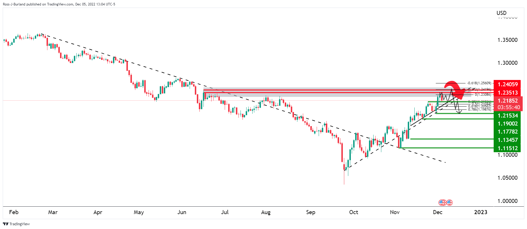 按照前期分析,英鎊/美元空頭加快步伐,尋求跌破1.2150,英鎊仍處在看漲趨勢,但正在測試1.2200和1.2150下方的動能。到目前為止,本周英鎊/美元走出的最低水平是1.2152,以下圖形顯示,若空頭走強,英鎊/美元將大幅整理。