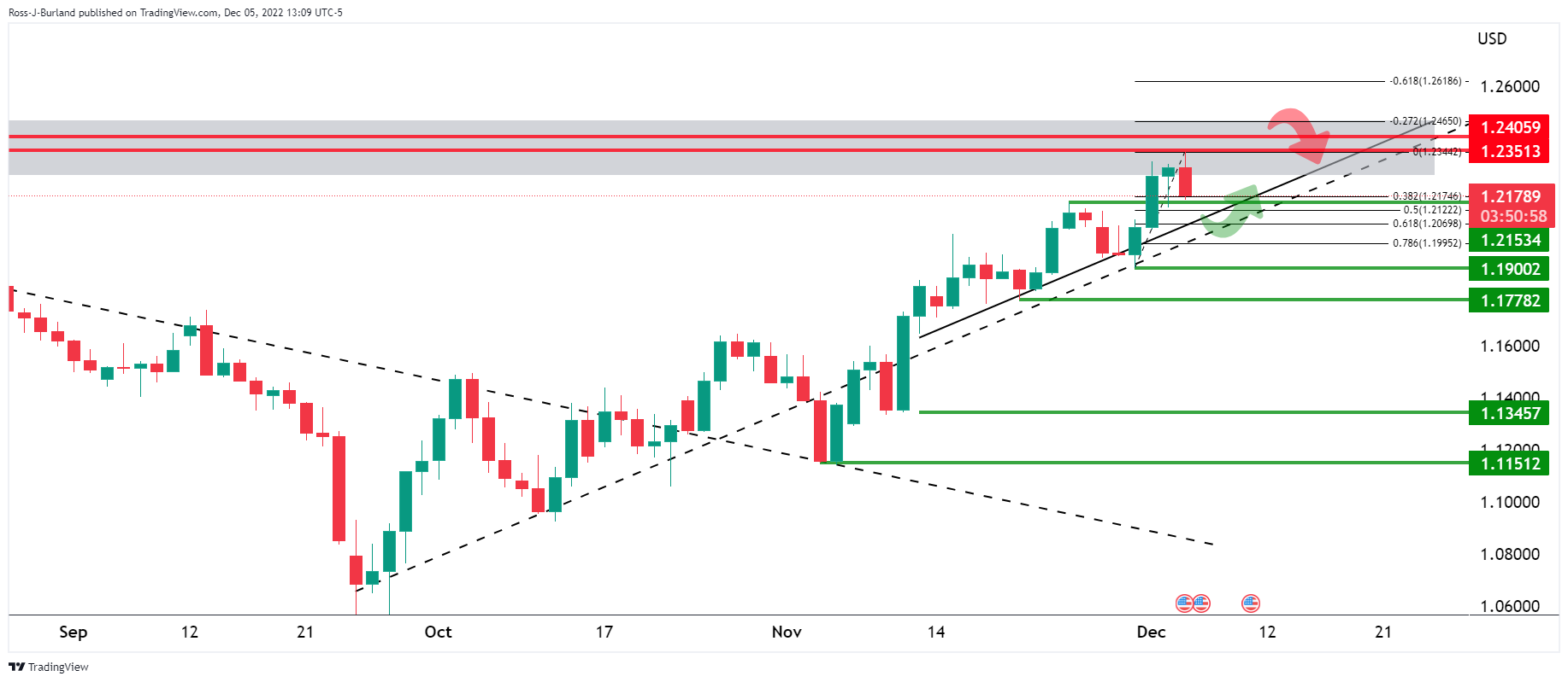 4小時圖顯示,英鎊/美元可能正構築頭肩形態,更低的高位處在右肩。這增加英鎊/美元跌破1.2150區間形態的機率,從而匯價將測試趨勢線支撐位和關鍵水平1.21。