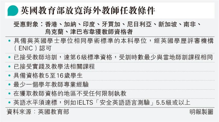 英國教育部亦設6項條件及英語水平要求(見表),包括申請人要具備與英國學士學位相同學術標準的本科學位,經當地學歷評審機構(ENIC)認可、最少一個學年教師專業經驗、英語水平須達標,例如IELTS「安全英語語言測驗」5.5分或以上。英國教育部又稱,明年底前將進一步要求申請人提供獲數學、科學普通中等教育證書(GCSE)第4級同級水平的資歷。