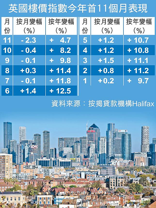 據按揭貸款機構Halifax資料,英國11月樓價指數連續第3個月下跌,且按月跌幅擴大至2.3%,為2008年10月以來最大跌幅,平均樓價回落至285,579英鎊(約270萬港元),創8個月低位;按年比較則錄4.7%升幅,是連續第5個月升幅放緩。