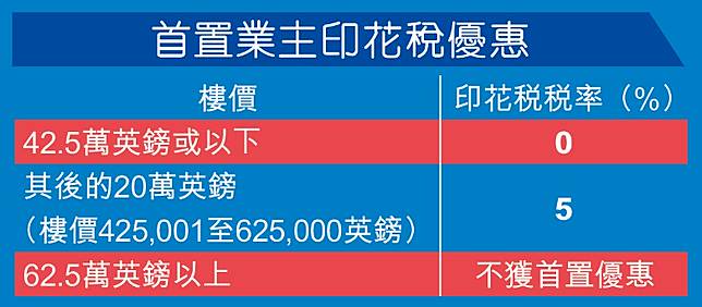 目前英國的首置免稅門檻已由30萬英鎊(約284萬港元)提高至42.5萬英鎊(約402萬港元),超出42.5萬英鎊的部分需要繳交5%印花稅,而樓價62.5萬英鎊(約591萬港元)以上的物業則不獲首置優惠。因此,如果首置買家買入50萬英鎊(約473萬港元)的物業,需要繳交的印花稅為(50萬-42.5萬)x5%,亦即3,750英鎊(約3.54萬港元)。