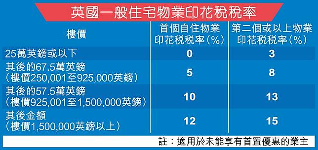 如果沒有首置優惠,25萬英鎊(約236萬港元)以上的首個自住物業會被開始徵收印花稅,並將按樓價的超出金額遞增收取5%、10%及12%的印花稅稅率,當中超過150萬英鎊(約1,418萬港元)的物業需要繳付最高的稅率。另外,若業主已經擁有一項住宅物業,再買入其他住宅物業便需要繳付比自住物業高3%的印花稅稅率。