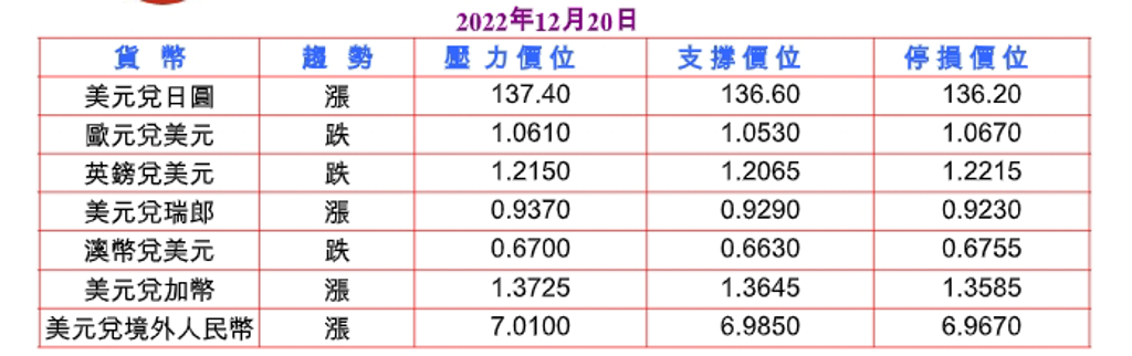 昨日World Economics調查顯示,中國12月商業信心指數創至少2013年1月以來最低48.1,反映新型冠狀病毒(COVID-19)病例激增影響明年經濟可能衰退,但中國承諾明年推出新的經濟支持舉措,並據澳洲總理阿爾巴尼斯稱,澳洲外交部長黃英賢本周將訪問中國,表明兩國外交關係有望改善,而且澳洲上調本財政年度資源和能源出口收入預估達創紀錄4,590億澳幣,支撐澳幣、紐元等風險貨幣,扶助歐元兌美元穩守1.0574低點。