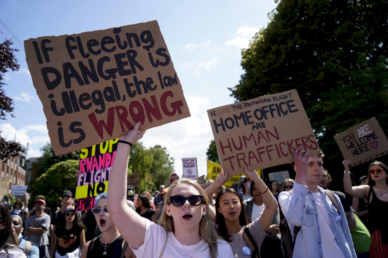 圖為6月間英國民眾抗議政府,將尋求庇護者驅逐到盧安達的意圖。(AFP/檔案照片)