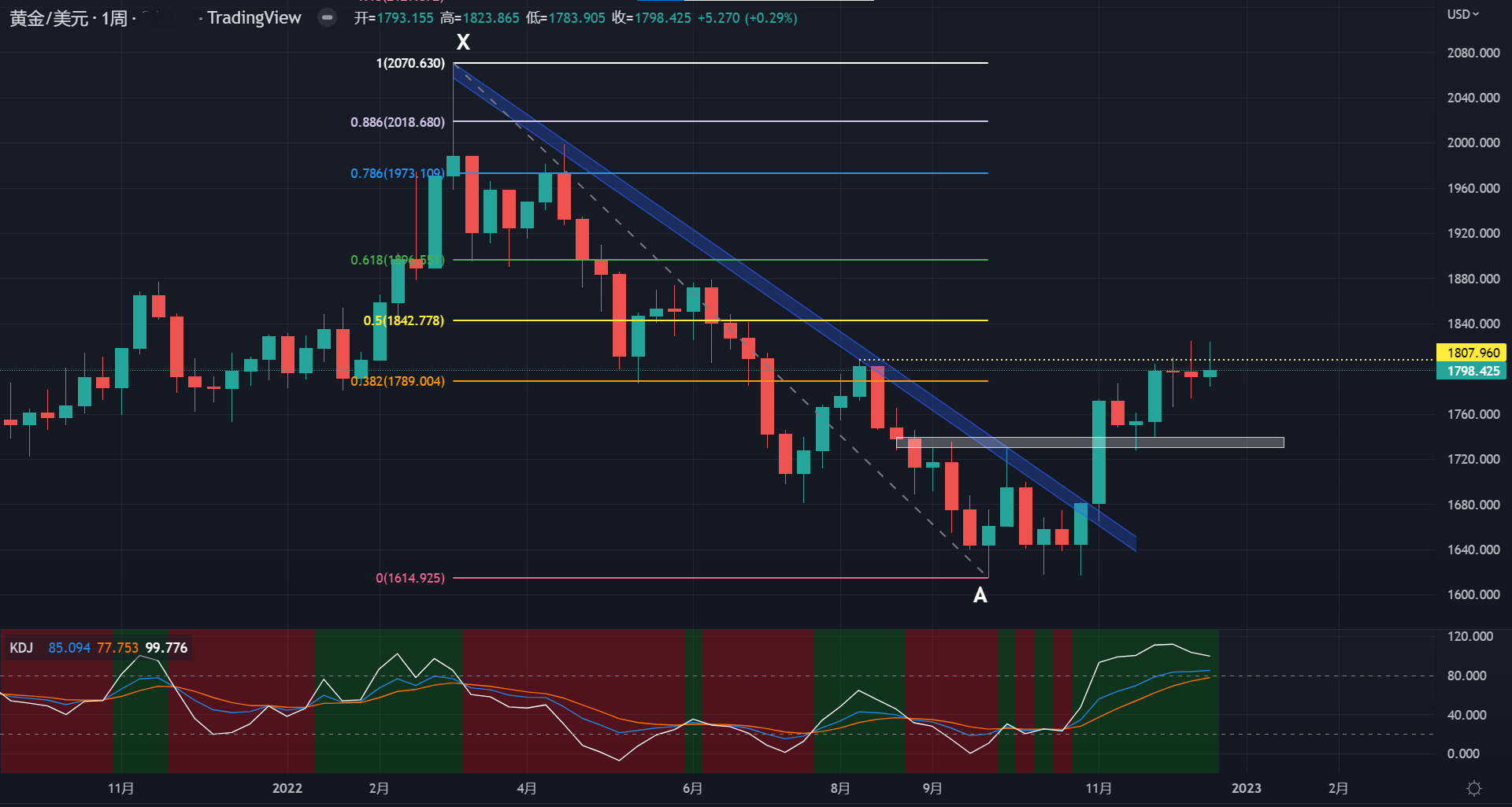 黃金的周線圖顯示,價格於3月7日當周觸及2071(X點)後持續承壓,於9月26日當周最低下探1615(A點),隨後行情止跌回升,漲破X點以來的下行趨勢管道及1730~1735區域阻力並階段性見底。