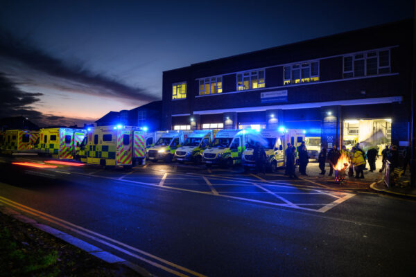 2022年12月21日,在英國倫敦,救護車工人和支持者在肯頓救護站外集會,討論工資和條件的罷工問題。(Leon Neal/Getty Images)