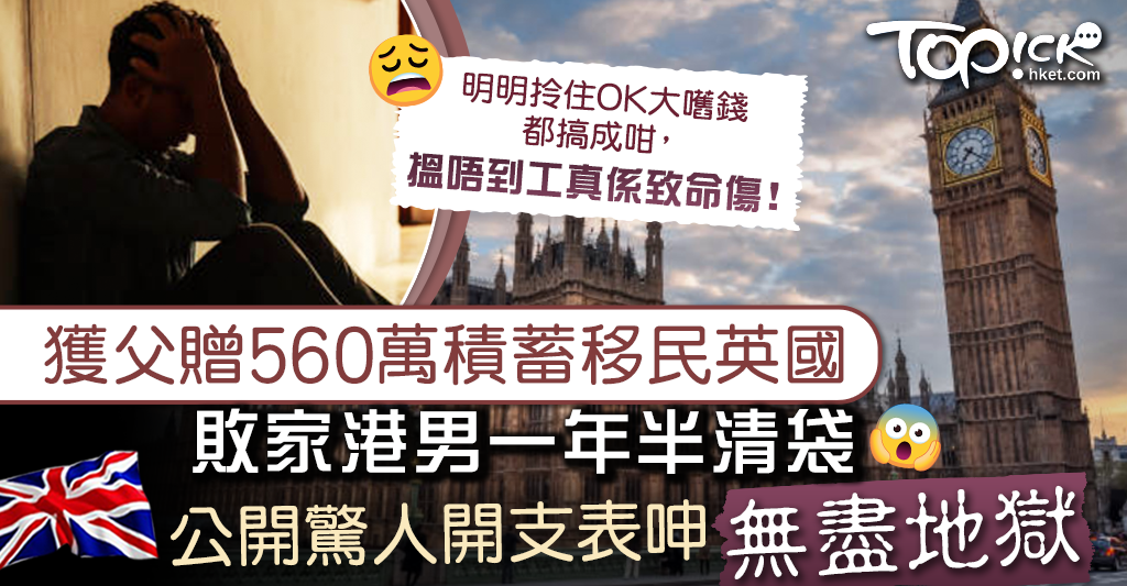要移民外國,除了有足夠資金,更應該做好計劃和預算。有港男近日在網上討論區分享移民近況,他表示父親送贈逾560萬港幣讓他移民英國,然而他因英文水平差未找到工作,經過一年半後沒收入的生活,積蓄都幾乎花光,感嘆這裡是「無盡地獄」,惟他公開自己使費清單後,引來大批網民指責,直言「咁大使畀幾多都無用」。