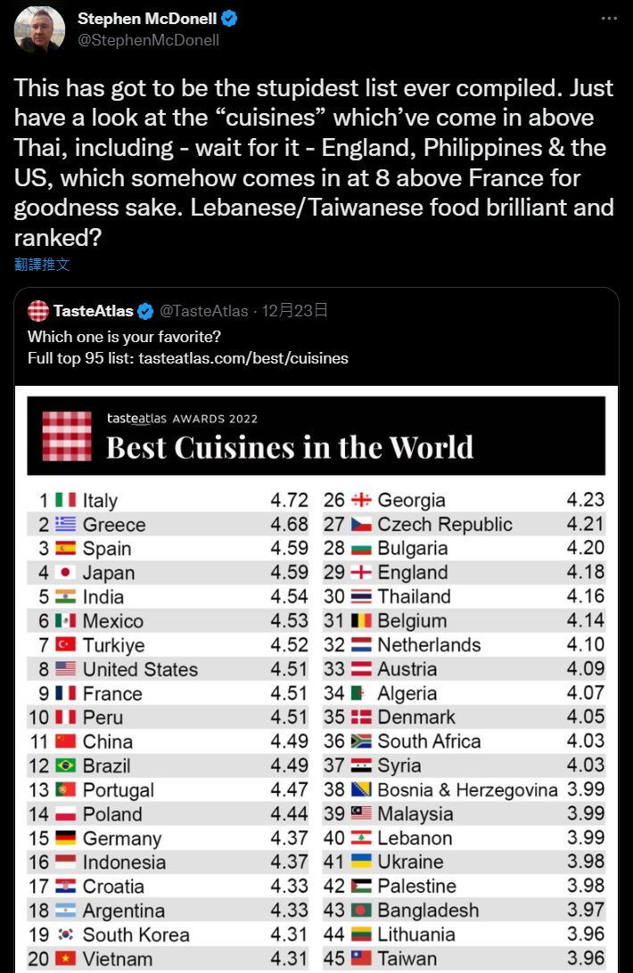 連駐北京的BBC記者麥唐納(Stephen McDonell)也在Twitter上發表看法「這肯定是史上最蠢的美食排名,看看這些排在泰國前面的『美食』,竟有英格蘭、菲律賓、美國,而美國甚至還贏法國,另外黎巴嫩、台灣的排名是否也該更往前?」(編輯:潘毅)