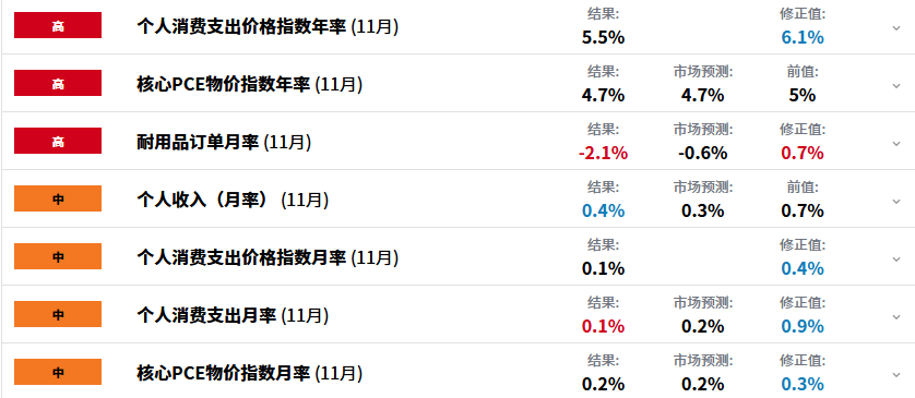 剔除食品和能源價格的核心PCE物價指數11月同比增長4.7%、市場普遍預期4.6%、前值5%。11月核心PCE物價指數環比增長0.2%,與市場預期一致,前值修正值為0.3%。
