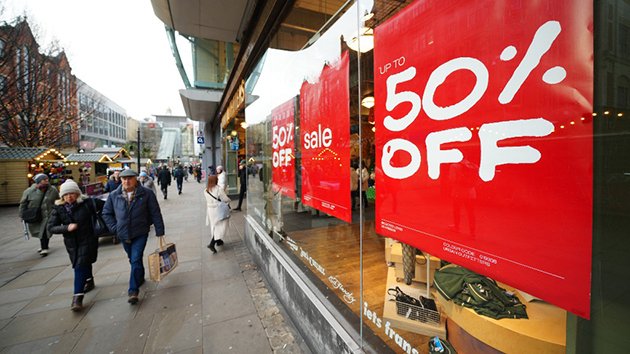 頂圖:12月13日,人們走過英國曼徹斯特街上的促銷廣告。新華社
