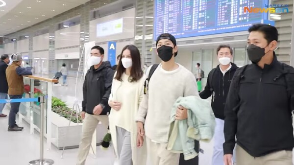 ▲宋仲基7日戴著女友從新加坡返韓時,見到媒體也毫不避諱。(圖/翻攝YouTube/뉴스엔·NewsenTV·KOREA Entertainment news)