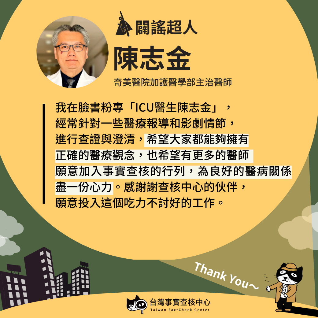 我在臉書粉專「ICU醫生陳志金」,經常針對一些醫療報導和影劇情節,進行查證與澄清,希望大家都能夠擁有正確的醫療觀念,也希望有更多的醫師願意加入事實查核的行列,為維護良好的醫病關係盡一份心力。
