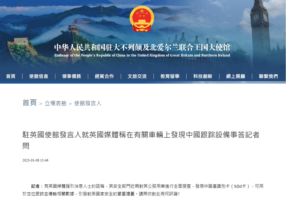 報道稱,涉事SIM卡在該輛公務車的一個中國進口密封零件內發現。中國駐英使館在網頁回應報道,稱中國做事一向光明正大,堂堂正正,沒有必要也沒有興趣去搜集英國車輛定位信息;又說英方一些人不要患上被害妄想症,動輒疑神疑鬼,奉勸英方有關人員停止散布虛假消息,停止賊喊捉賊的把戲。 (英國報章《i》/中國駐英國大使館) Source 文章導覽 英國官員用車竟發現中國追蹤設備 持續攻城略地Kia 於英國市場達成年銷10 萬輛里程碑 – 小七車觀點