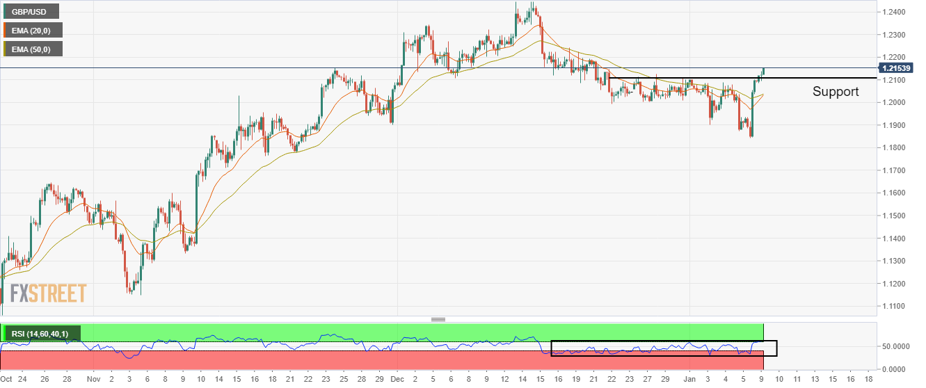 英鎊/美元已經突破了從12月27日高點繪製的水平阻力約1.2112,該阻力現在已經成為英鎊/美元的支撐。 20週期和50週期指數移動平均線(EMAs)即將在1.2038附近形成看漲交叉,這將增加上行的壓力。