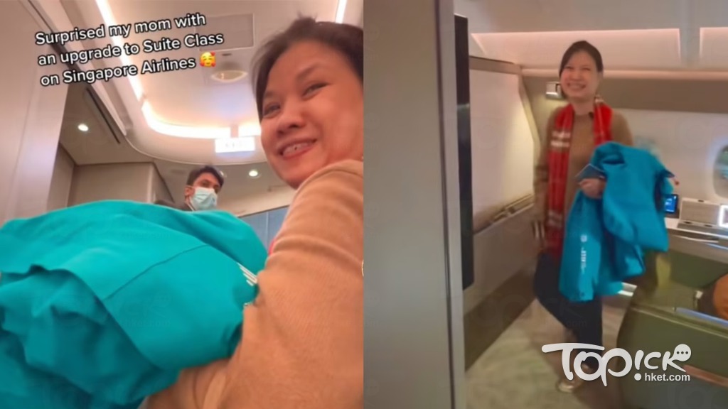 長途飛機要坐的舒適,最好可以坐商務客位,甚至頭等艙。新加坡一名男子為了讓媽媽的旅途更舒適,悄悄地將媽媽的座位升級為頭等艙,媽媽上飛機後才獲悉事件,兒子拍下媽媽的驚喜反應,不少網民則大讚男子孝順。