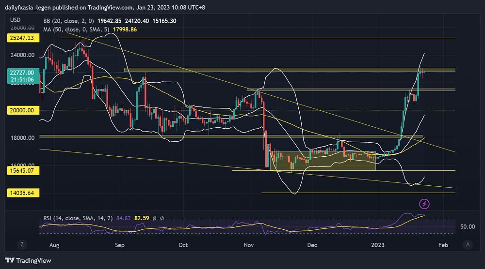 日圖顯示,比特幣(BTC)突破11月震盪高點21500附近阻力後大漲,目前開始測試去年9月高點至23000附近阻力。若能有效突破,進一步上行或升向24000以及去年8月高點25000一線。