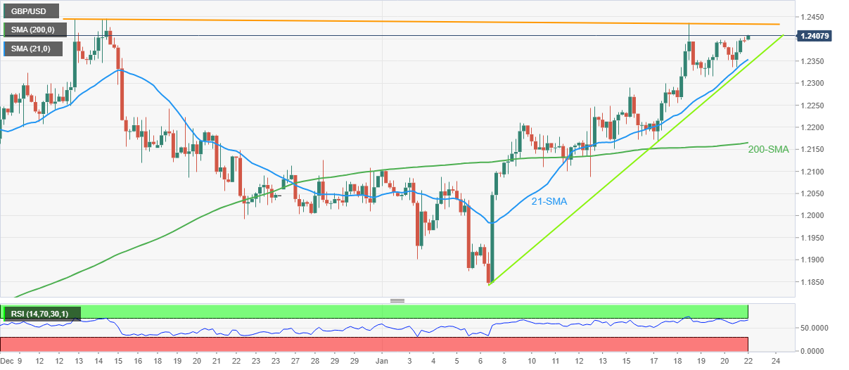 除21-SMA支撐外,1月06日以來的上行傾向支撐最新處在1.2340附近,也構成匯價短線支撐。