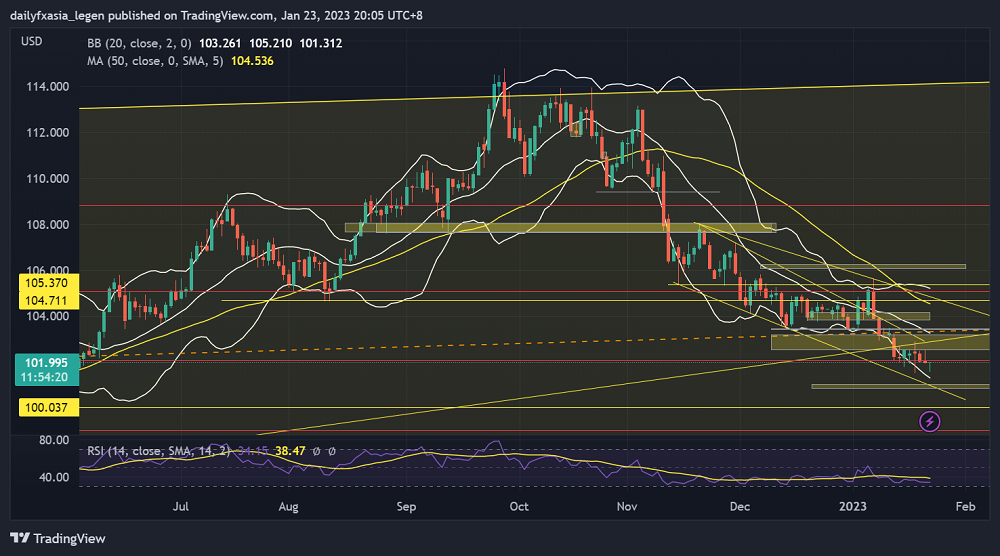 目前美元指數顯示明顯跌破102的跡象,這可能為進一步下行打開大門,往下初步目標看向101至去年5月低點101.30區域,若跌破可能暴露100關口。