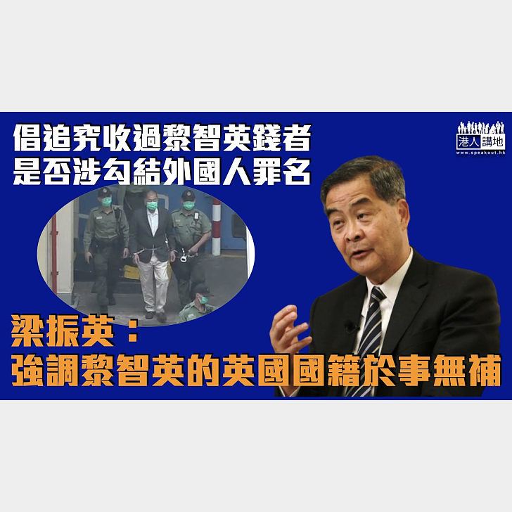 此外,梁振英指出,英國和美國支持黎智英的人告訴大家,黎在將近30年前已成為英國人,所以,這些年來一直有一個英國人在中國香港,大量資助政黨並策劃反對中國的政治運動。他認為,所有在香港拿過黎智英錢的人,都應該以涉勾結外國人的罪名追究,又指有些英國人從未想過真正將香港交還給中國。